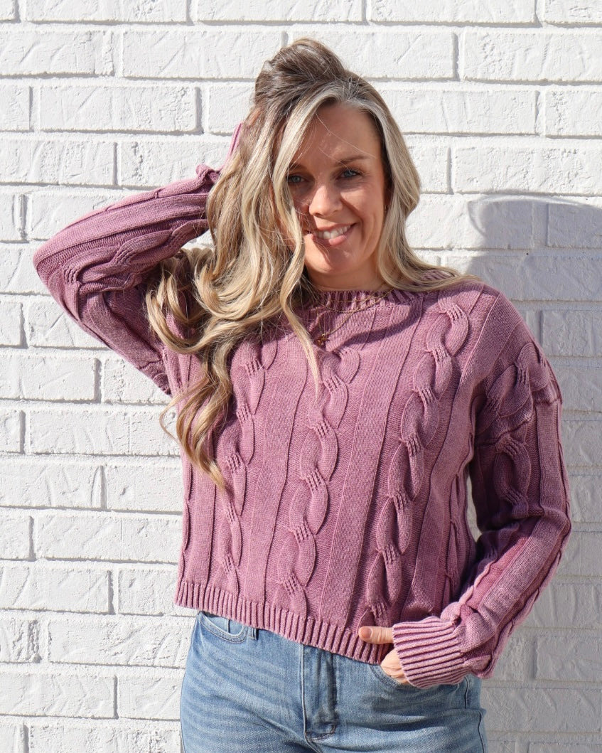 Elevate your everyday wardrobe with this beautifully washed cable knit sweater in rich purple. The textured cable knit pattern adds visual interest and dimension, while the soft, pre-washed fabric offers a lived-in comfort that feels instantly broken in. Perfect for layering over basics or wearing solo, this versatile piece transitions seamlessly from casual weekends to relaxed office settings. The classic purple hue pairs effortlessly with neutrals and denim, making it a go-to staple you'll reach for season after season. Cozy, timeless, and undeniably wearable.