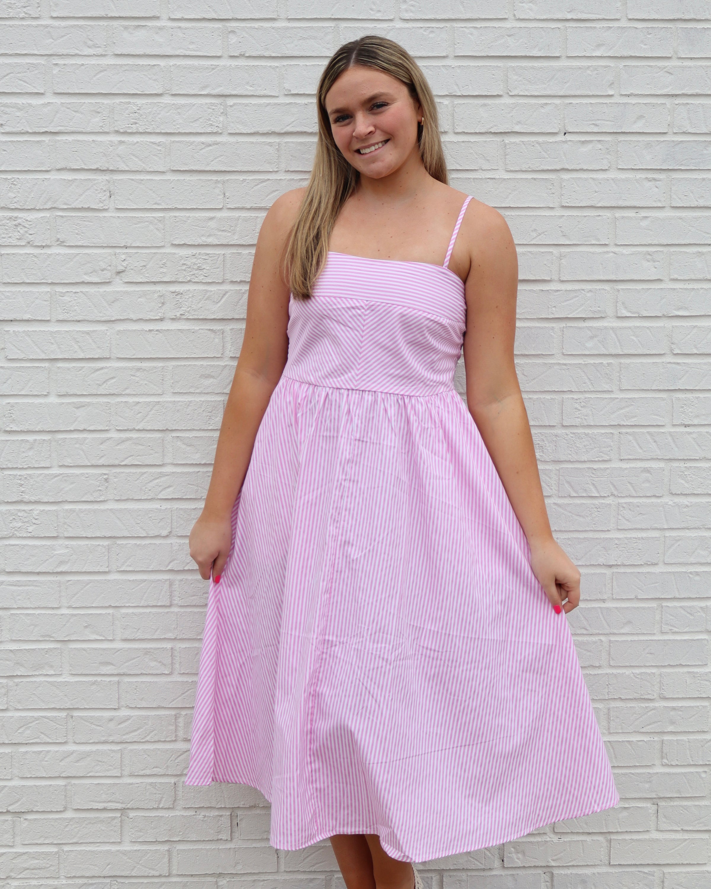 Effortless elegance meets everyday comfort in this striped spaghetti strap dress. The soft pink palette pairs beautifully with classic stripes, creating a timeless look that transitions seamlessly from casual outings to relaxed gatherings. Delicate spaghetti straps offer a flattering, feminine silhouette while the lightweight fabric keeps you cool and comfortable all day long. Perfect for layering or wearing solo, this versatile piece becomes an instant favorite in any wardrobe.